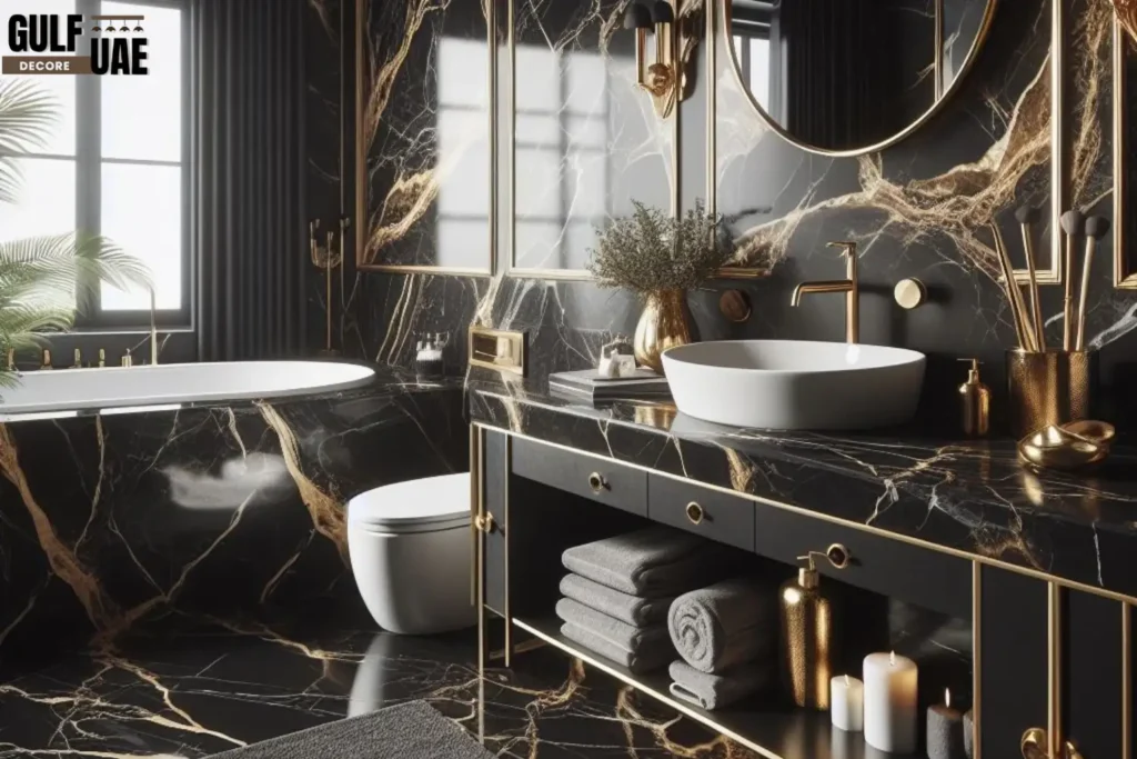 Black fixtures and metallic accents like rose gold or brushed gold are frequently combined in Dubai interior design. Warm metallics and matte black taps create contrast and a luxurious vibe without being overly ornate.