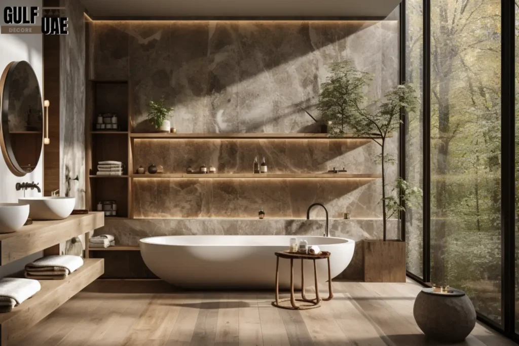 Marble is not only classic; it is also a staple of Dubai design. Dramatic marble on walls and floors, such as Arabescato or Calacatta Gold, instantly adds grandeur. A smooth, spa-like effect is provided by large slabs with little grouting.