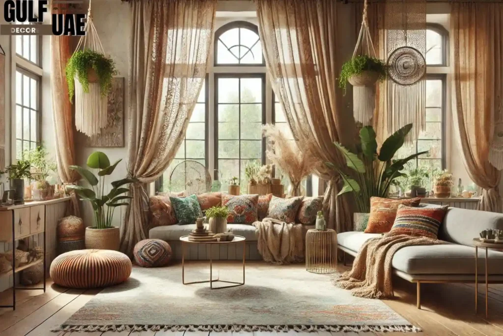Bohemian curtains with macramé or embroidered patterns add a cozy and eclectic vibe. Perfect for a relaxed living room atmosphere.