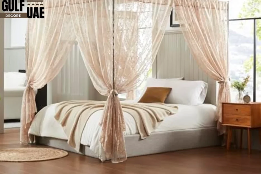 For a luxurious and unique look, custom-made canopy curtains frame your living room windows like an art piece. Perfect for Dubai homes that love bespoke interiors.